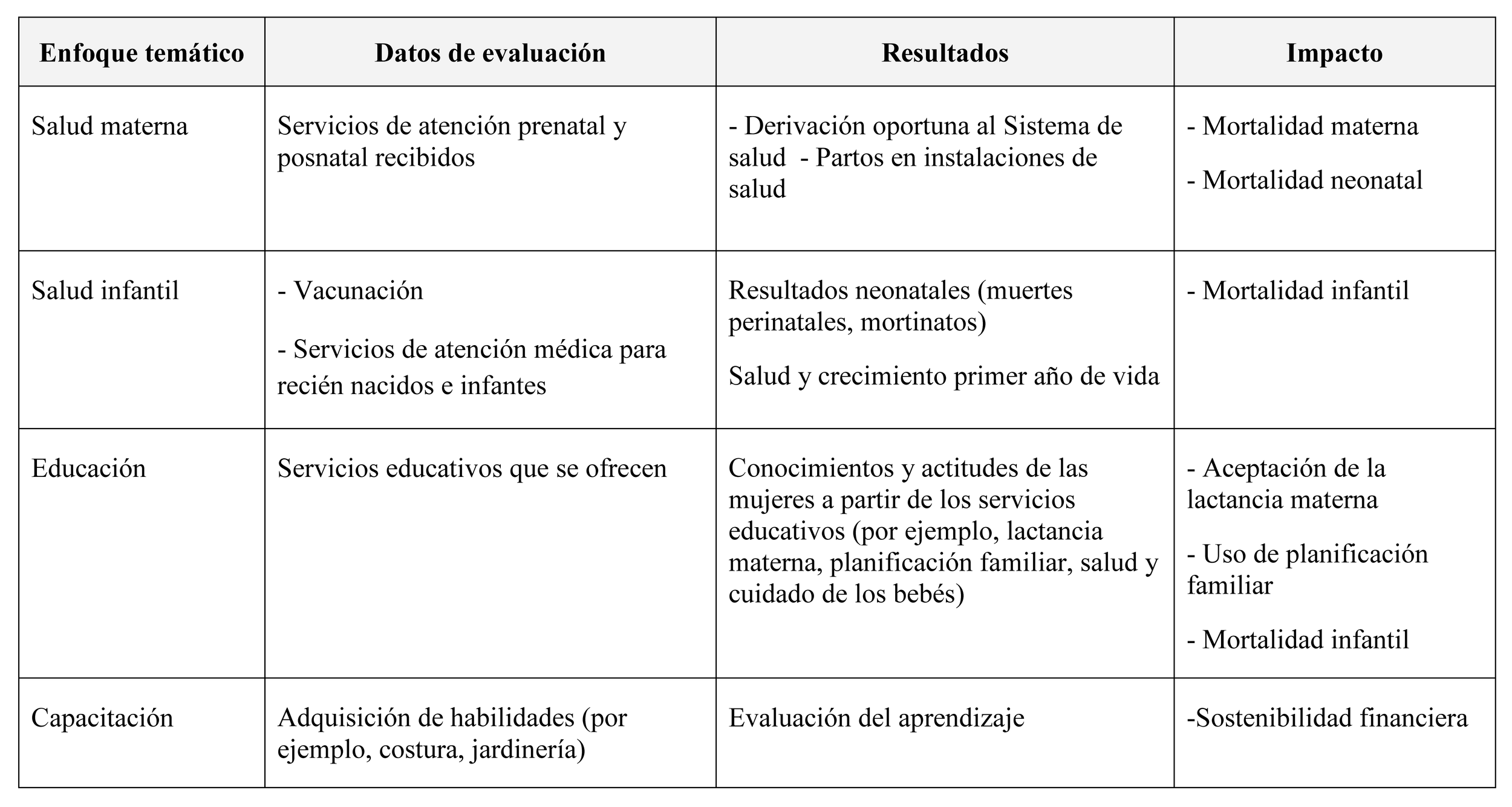 Los datos de la evaluación se centran en los resultados medibles que demuestran el impacto a largo plazo. Pueden centrarse en áreas más amplias, como la salud materna, la salud infantil, la educación y la capacitación. En la tabla siguiente se muestran algunos ejemplos comunes de datos de evaluación, resultados e impacto.