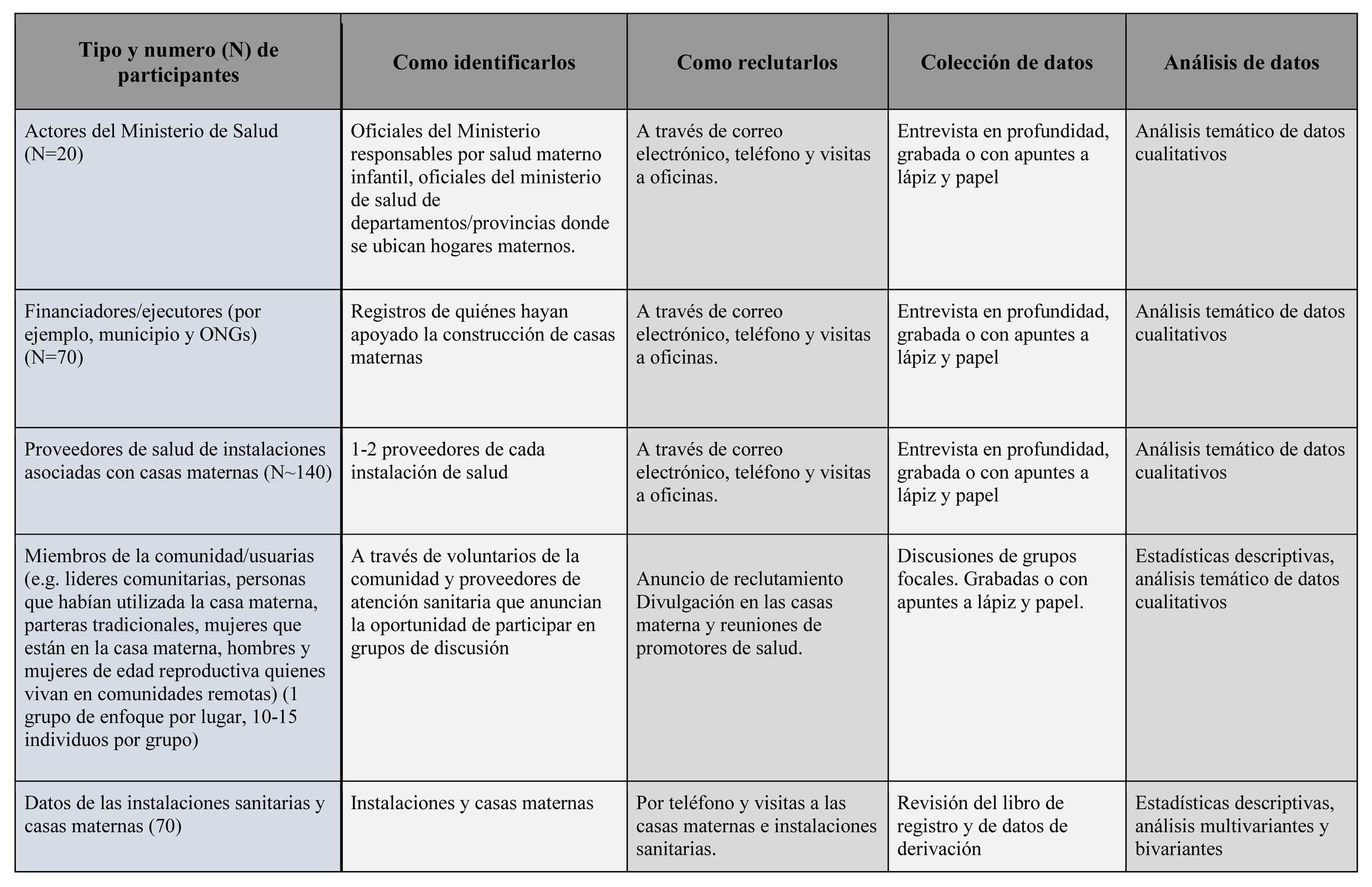 Modalidades de medición (encuestas pre/post, ensayo de control aleatorio de hogares de espera de maternidad, diseño cuasi-experimental, emparejamiento)